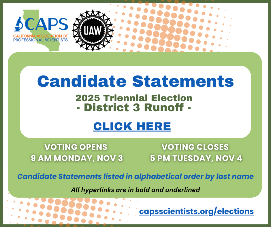 Their candidate statements are available below. You can learn more about these positions in our CAPS, UAW Local 1115 Bylaws ! Or email elections@capsscientists.org with questions.